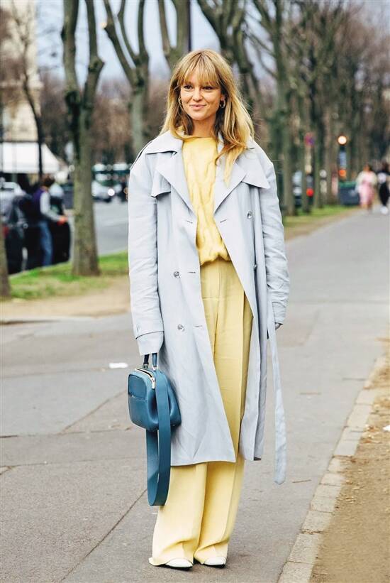 此外,婴儿蓝和牛油果绿、奶油黄等流行色的撞色搭配也是很合拍的,怕显黑的话可以把这些颜色穿在下半身,显白的婴儿蓝穿在上半身,就能更好地驾驭。 |