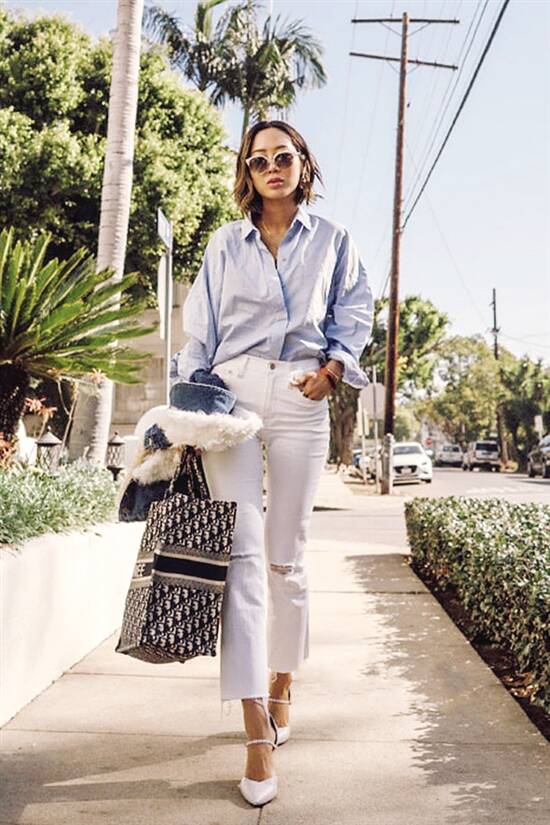 ▲衬衫别忘选宽松款,搭配高腰裤和高跟鞋,又飒又干练的职场感,是都市里不容忽视的风景。 |