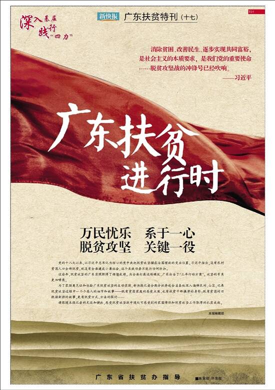 新快报在扶贫工作的宣传报道上不遗余力。从2018年10月17日开始,在广东省扶贫办指导下,连续推出系列扶贫报道《广东扶贫进行时》,至今年2月28日,新快报共推出十七期《广东扶贫进行时》,3月8日又推出《三八妇女节·扶贫女干部好故事》特刊,致敬在扶贫战线上巾帼不让须眉的广大扶贫女干部。 在推出扶贫特刊的同时,又和广东省扶贫办联合推出《广东脱贫攻坚好故事》一书,迄今已出版七集。2019年又和广东省扶贫办联合推出《扶贫日记》征文活动。 一年多来,新快报记者实地走访了广东省内数十个贫困村,与一线扶贫干部和贫困户面对面深入交流,同时更将视角扩向东西部,对广东对口帮扶的东西部地区如贵州、西藏、广西、四川、云南等地的对口帮扶进行了报道。记者看到,经过帮扶,贫困群众收入水平大幅度提高,自主脱贫能力稳步提升,贫困地区基本生产生活条件明显改善,群众出行难、用电难、上学难、看病难、通信难等长期没有解决的老大难问题普遍解决,义务教育、基本医疗、住房安全有了保障。贫困地区经济社会发展明显加快,基本公共服务日益完善,贫困治理能力明显提升,基层组织得到加强,基层干部本领明显提高。 新快报以新闻视角深度挖掘扶贫工作中的点点滴滴,为奋战在扶贫第一线的广大党员干部助力,为打赢脱贫攻坚战鼓与呼。 新快报还发挥媒体资源优势,助力开展消费扶贫,2019年3月,新快报特别推出来自贵州毕节纳雍的“玛瑙红樱桃”定制版爱心礼盒,以实际行动助力“最后一公里”的脱贫攻坚战。 新快报《广东扶贫进行时》见证了广东脱贫攻坚和东西部扶贫协作的稳步推进,为打赢脱贫攻坚战贡献一份媒体力量。 ■新快报记者 赖妍 感言 “脱贫攻坚,是一次前无古人的壮举,一场波澜壮阔的中国行动。新快报推出《扶贫特刊》,记录下脱贫攻坚中感人的细节和故事,每一篇报道都沾着露珠,带着泥土味,在田间地头记录下这场为减贫打响的宏大攻坚战。我们以脚力、眼力、脑力、笔力,践行了媒体的担当和责任。” ——新快报编委、编辑中心主任 李志
