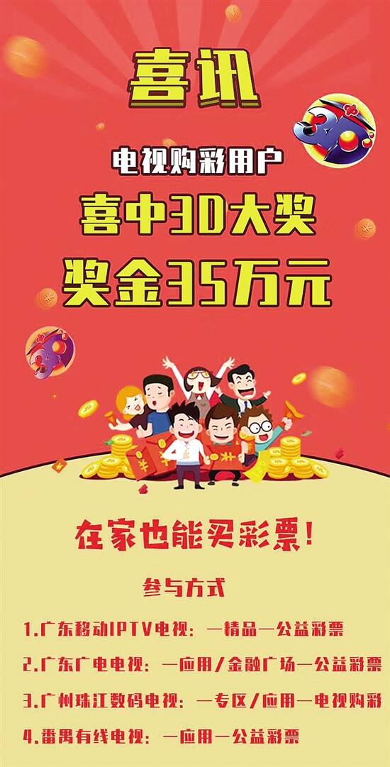 第20036期福彩3D摇出中奖号码“740”,电视购彩中山用户先后4次倍投单选“740”,结果一举中得354640元!据中奖用户介绍,他是福彩3D游戏的忠实粉丝,偶然在家看电视的时候看到了“电视购彩”,他觉得这种可以在家买彩票的购彩方式很新颖,便抱着试一试的心态注册并倍投了他近期在追号的3D直选号码,没想到这一试就让他捧得大奖。 中奖用户说这注中奖号码,他已经追了两个多月。之所以会买这注号码,是因为在去年他曾灵机一动决定反过来投注3D往期的开奖号码,这个方法让他在去年中了3D大奖10万多元。所以这次他用同样的方法来追号,没想到才第一次在电视购彩买彩票,就刷新了他中大奖的纪录,直呼电视购彩是他的中奖宝地,以后就只用电视购彩买彩票了。 据了解,电视购彩是在广东省不涉及互联网的电视专网内,通过广东省专网电视运营平台设置业务入口,以电视机为终端进行实名注册和投注信息提交的福利彩票销售模式。目前电视购彩实现了“双色球”“南粤风采36选7”“3D”“好彩1”等四个彩种的投注及兑奖功能。电视购彩通过家中的电视机即可完成下单投注,开奖后若中奖奖金自动到账。宅在家即可享受购彩和中奖的乐趣,也能为公益事业贡献一份力量,既方便又安全。 电视购彩进入路径 1.广东移动IPTV电视 选择【精品】—【公益彩票】进入【电视购彩】 2.广东广电高清互动平台(u互动): 选择【金融广场】—【应用/财富】进入【电视购彩】 3.广州珠江数码甜果电视 选择【应用/专区】进入【电视购彩】 4.广州番禺有线电视 选择【禺乐+】—【公益彩票】进入【电视购彩】