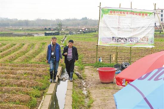 ■中山市西区驻扬名村第一书记肖光永(左)到姬松茸种植基地查看情况。 |