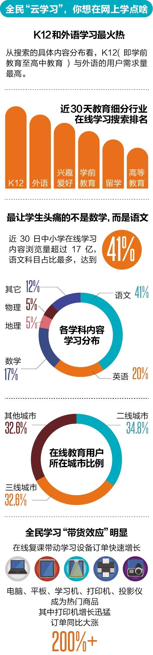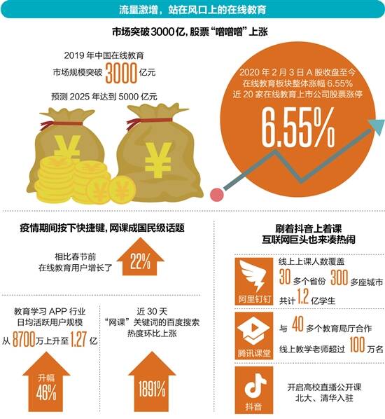 疫情助力在线教育转危为机,互联网巨头加码入场 在线教育行业意外也将此次疫情“危机”转化为发展“契机”。据QuestMobile数据显示,相比去年春节,在线教育用户增长了22%,教育学习APP行业日均活跃用户规模从平日的8700万上升至春节后1.27亿,升幅46%。另外有数据显示,2019年中国在线教育市场规模突破3000亿元,预测2025年中国在线教育市场规模近5000亿元。除此之外,近30天“网课”关键词的百度搜索热度中直线攀升,环比上涨1891%,成为国民级热度话题。 在线教育流量短时间内的激增引起了资本市场的重要关注。有关数据显示,自2020年2月3日A股收盘至今,在线教育板块整体涨幅6.55%,A股近20家在线教育上市公司股票涨停。而以互联网巨头为代表的部分企业,也加快了布局在线课堂的脚步。 数据显示,截至2月10日,全国30多个省份、300多座城市的学校加入了阿里钉钉的“在家上课”计划,预计覆盖全国5000万学生。与此同时,腾讯教育也进一步扩大“战场”,与全国40多家教育局厅展开接触,通过腾讯课堂、腾讯会议等方式开展教学工作的老师超过100万名。另外,抖音也开启了高校直播公开课,清华大学、北京大学等知名高校入驻。 另一方面,在线教育品牌也抓住了此次意外流量,纷纷通过增开课程、设立教育基金等形式参与这场“大混战”。其中,新东方在线首先宣布向全国中小学生免费开放所有春季班直播课程,学而思网校推出与校内时间同步的免费直播课,跟谁学、VIPKID、猿辅导、作业帮、网易有道等教育机构也陆续跟上,开放相应课程,课程范围涵盖全学段各年级。 值得注意的是,大批量的线下教培机构也展开了线上转型之路。但在紧急转型过程中,对于一些此前线上业务探索零经验的机构而言,遇到的困境会更多,其中就包括最重要的转化率问题。行业专家表示,随着不少省份开学时间陆续确定,疫情结束后的在线教育需求可能会面临急速萎缩,大部分家长会把孩子的学习时间交回线下课堂。这也就意味着,短期的流量红利过后,各类教育培训机构对于学生上课资源的“争夺”会更加激烈,学生所能分配的时间也会更少。对于中小机构而言,在资金、技术和流量的多重压力下,将面临淘汰出局的危机。 ■勠力同心防疫情,全力以赴迎复课 ■数据来源:艾媒咨询《2020年春季中国学校在线复课效果评估专项调研报告》;中商产业研究院《2020年在线教育行业市场前景及投资研究报告》;前瞻网;百度大数据;半月谈