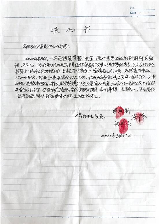 ■新快报记者 陆妍思 通讯员 巫倩敏 申请一“战”到底,承诺不胜不休 佛山福彩中心党支部把11名党员分成了三批,原计划于2月7日起陆续下沉到社区疫情防控一线,共筑疫情“防火墙”。党员蔡建新、钟良、张泰山3人作为第一批党员先锋,他们恪尽职守,一天没有松懈过。近日,随着各大企业复工复产,市福彩中心体恤一直坚守在一线的党员干部们,遂安排第二批党员干部出战顶上,但被他们拒绝了。蔡建新表示:“感谢中心支部对我们的关心,但随着企业复工复产,外来人员大量涌入,我们在这里坚守有一个多月,对清水桥社区的居民以及周边的情况十分了解,越是疫情防控形势严峻复杂,我们就越不能退。所以我们向中心支部申请一‘战’到底,承诺不胜不休。”3月17日,3人义无反顾签下了《决心书》,做好坚守到底的决心。 从社区大门到居委会, 坚定信心从未动摇 从2月7日起,至3月19日,党员蔡建新、钟良、张泰山都投身在张槎街道清水桥社区弼唐西二街的防控点,主要负责出入社区的人员体温监测、车辆监测以及防疫知识宣传的工作。42天的时间里,他们一共检测车辆16701车次,共检测人员体温101599人次,每日的工作量都十分繁重,但他们依然做到细致入微,受到社区居民与居委会的一致好评。 3月20日起,他们三人服从基层统一指挥和调配,换到了居委会协助防疫工作的开展,工作由单一变成多样,难度升了几个等级。刚调换岗位的第二天一大早,他们就接到社区通知有一位刚从湖北回来的居民,他们立即上门为其办理居家隔离的相关手续,登记信息、测量体温,并协助相关医护人员对其进行咽试纸测试。工作场地的改变、工作内容的改变、服务对象的改变,都丝毫没有改变他们要打赢胜仗的坚定信心,他们纷纷表示,作为党员,还是要坚守在前,不畏艰险,展现自我价值,他们将愈战愈勇,愈战愈有底气! 这些天来,他们一是对社区19个防控点进行检查与服务,既要了解各防控点工作开展的情况,还要关切大家的需求;二是对社区湖北籍人员未返回的进行上门检查,逐一做好登记,重新张贴封条,不放过一人、不漏一户;三是对社区居家隔离人员进行上门服务,了解他们的身体状况,并送上生活物资、收集垃圾等;四是给社区居民派发口罩;五是协助完成居委会交待的其他工作等等。“刚开始还是有点害怕的,因为要近距离的接触湖北返佛山的人员,为他们购买生活物资送上门、收集生活垃圾、检查封条、张贴封贴等等工作,每天都会上门服务,不过我们都会认真做好个人防护工作。直到上门的次数多了,每天见到他们赞赏的目光,听到他们赞扬的言语,我们渐渐地放下了心中绷紧的弦,开始感受到这份工作所带来的荣耀感,我们会继续努力,坚持到底”,佛山福彩党员张泰山感慨地说道。 越是困难越显担当,截至3月25日,佛山福彩3名党员已在社区抗疫一线奋战48天,服务384个小时,但是他们深知责任重大,一刻都不敢放松,他们奋勇向前,奋战一线,用行动完成为民服务的使命,用行动诠释了一名党员应有的责任与担当,为全面打赢这场疫情阻击战奉献了坚实的力量,相信经过联防联控与群防群治,一定能迎来最终的胜利。