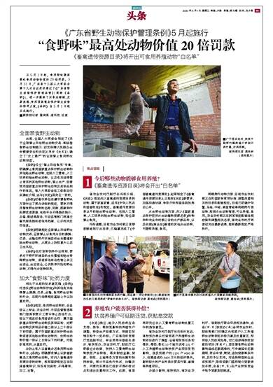 从5月1日起,食用野味最高要处食用动物价值的20倍罚款。3月31日,广东省十三届人大常委会第十九次会议表决通过了《广东省野生动物保护管理条例》(简称《条例》),进一步提高了对非法猎捕、交易流通、食