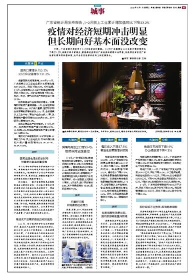 日前,广东省统计局发布了1~2月经济运行数据。1~2月广东规模以上工业累计增加值同比下降23.2%,省统计局专家指出,新冠肺炎疫情对广东经济的短期冲击明显,但疫情没有改变广东经济长期向好的基本面,