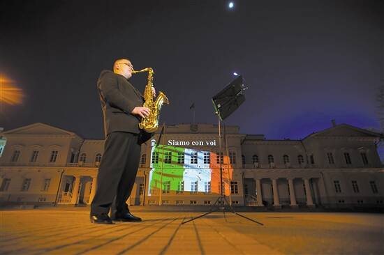 3月31日,在立陶宛首都维尔纽斯,立陶宛总统府在灯光秀中投射出意大利国旗图案。3月31日晚,在立陶宛总统的倡议下,立陶宛总统府、国防部和其他政府机构及著名景点上演灯光秀,以示对意大利抗击新冠肺炎疫情的支持。新华社发