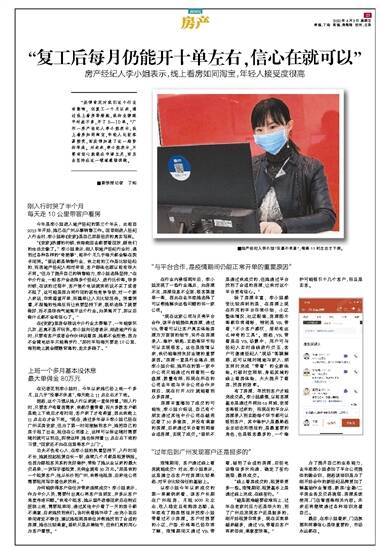 “疫情肯定对我们这个行业有影响,但复工一个月以来,通过线上看房等措施,我的业绩跟平时差不多,开了8—10单。”广州一房产经纪人李小姐表示,线上看房如同淘宝,年轻人比较容易接受,而疫情加速了这一趋势