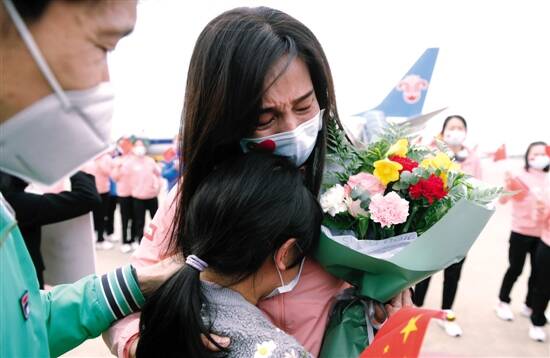 ■看到妈妈走下机舱,10岁女孩李熹雅迫不及待地把亲自挑选的鲜花送给妈妈,一家人紧紧拥抱在一起。 新快报记者 孙毅/摄 |
