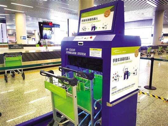 据了解,SEAONE紫外线手推车消毒机采用紫外线消毒原理,启动后会在地面的轨道上自动来回移动,通过自带的紫外线发射装置将紫外线投射到手推车上,实现360度全方位消毒效果,每次消毒时间约为5分钟,可同时对10辆手推车进行消毒。不仅大大提升消毒效率,同时也避免使用消毒液可能带来的手推车腐蚀以及日常消毒模式无法擦拭到的手推车篮筐、轮子等部位,实现对手推车全覆盖无死角消毒。 为确保旅客放心、安全使用,白云机场二号航站楼对手推车消毒再次升级,从最初的每10分钟进行一次消毒,到“一车一消、一客一消”,再到现在的“批量消毒”。消毒方式也从喷洒、擦拭84消毒液,到引进手推车消毒机,不断升级“加码”,确保手推车消毒“全覆盖、无死角”。