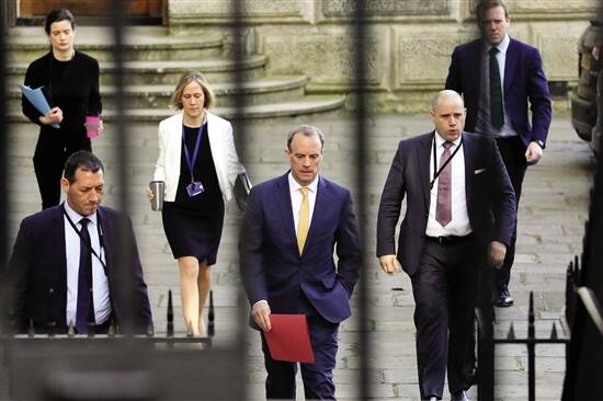 ■4月7日,在英国伦敦,代表约翰逊处理有关事务的英国外交大臣拉布(中)抵达唐宁街。新华社发 |