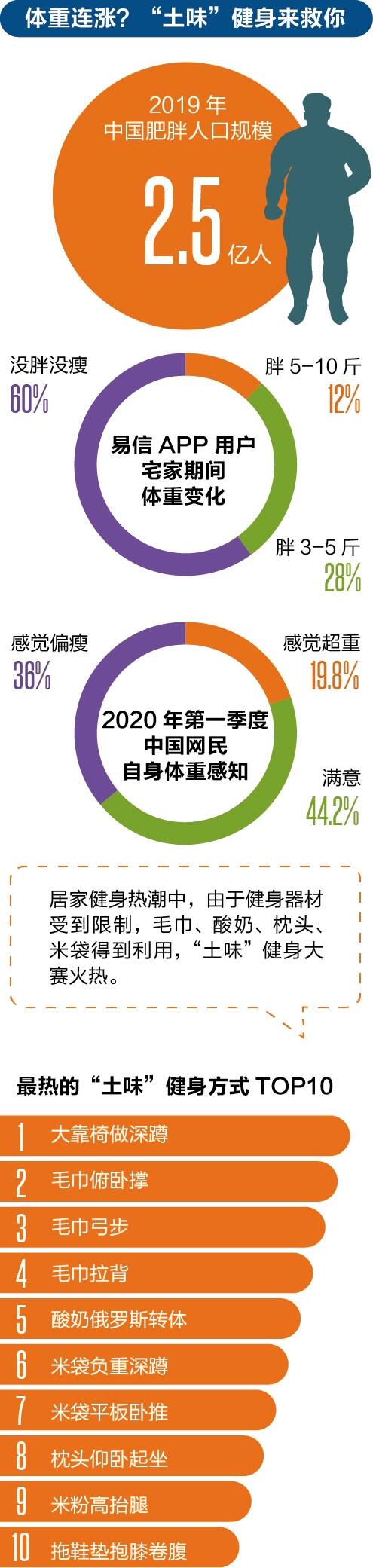 实际上,随着人们健身意识增强,近年来,国内健身消费市场已在逐渐扩大。人们不仅为健身房和健身器材消费,还更多地将金钱投入到垂钓、瑜伽等小众运动以及代餐食品中。更加健康、科学和有趣成为不少人在健身中追逐的目标。 ■策划:新快报记者 罗韵 ■统筹:新快报记者 梁彧 ■采写:新快报记者 郑栩彤 ■制图:廖木兴 “健身”保持高热度 互联网健身房火了 数据显示,2019年中国肥胖人群就已经达到2.5亿人,宅家不出门更是给了肥肉滋长的大好机会。调查数据显示,今年一季度,易信APP有近三成的用户胖了3-5斤。而受疫情影响,“超级猩猩”等众多健身品牌的门店暂停营业,健身爱好者和因宅家而“逐渐肥胖”的人们开始寻求家庭健身方法。新浪微热点数据显示,“云健身”的网络传播热度在1月24日起便逐渐攀升,并在2月底达到高峰。截至3月10日,新浪微博“宅家健身运动计划”已引来19.6亿人次围观。 “土味”健身方式开始冒头!家中的靠椅、毛巾、米袋、枕头等成为健身器械的替代品,人们开始在客厅和卧室练习俯卧撑、深蹲、卷腹和俄罗斯转体,甚至连冬瓜都能用来辅助做箭步蹲!数据显示,女生最爱的宅家运动是跳绳、健美操和做家务,男生则最爱做俯卧撑、客厅马拉松和广播体操。至于宅家坚持运动的原因,主要包括了以下几方面——实现减肥塑形,提高身体素质,保持愉悦和增强自信心。 实际上,疫情之下,互联网健身房的优势更为凸显。疫情期间,互联网平台已成为健身教学和分享的“大本营”,Keep、超级猩猩等健身品牌方纷纷瞄准了线上直播授课路径,开启线上直播课程。新快报记者在其中一款互联网健身APP看到,用户可选择训练计划并观看免费教学视频,还可付费观看精品教学视频或享受其他服务。目前,不少互联网健身品牌已开设了线下店面,用户可购买团课或训练营享受线下服务。有分析认为,疫情期间线上健身的热度将转化为疫情后的健身房客流量,而以Keep、超级猩猩为代表的互联网健身、社交平台将拥有更多机会。 与相对简单、对器械要求不高的宅家健身需求相近,健身门槛低、课程设计上对无健身知识的新用户友好,正是新兴互联网健身房的一大特点。易观《中国互联网健身房市场专题分析2019》认为,通过课程设计和社交化特点,互联网健身房可以吸引更多新用户成为健身房会员。而付费模式更加自主便捷,健身方式更加碎片化和轻量化的特点也将助力培育更多健身用户。与疫情前相比,Keep 2月底的日下载量更是增加了近两倍。Keep、咕咚、糖豆广场舞、每日瑜伽和乐刻运动5个线上健身软件热度最高。