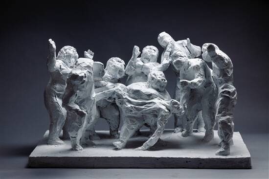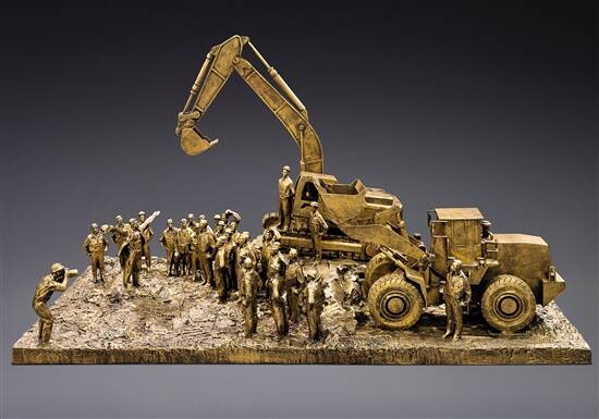 新冠肺炎疫情发生以来,广东各级人大代表、政协委员主动作为,发挥自身的优势,尽自己的努力,在这场没有硝烟的疫情防控战“疫”中,争当抗击疫情的战斗者、监督者、宣传者和示范者,尽显责任与担当。 17年前,非典时期,他曾雕刻钟南山英雄模样;而今,新冠肺炎疫情来袭,他再为钟南山塑像,取名《山高人为峰》。 “这次的作品是创造性的,以山为体,以人为峰,刻画出钟南山院士坚毅果敢、镇定从容的形象。”全国政协委员、广州雕塑院院长许鸿飞说,创作《山高人为峰》是情之使然,是发自内心的呼唤,“希望用作品致敬以钟南山院士为代表的广大战‘疫’医务工作者。” “记录时代是艺术家的责任。”特殊时期的许鸿飞,马不停蹄地创作了四件雕塑作品《我们在你身边》《山高人为峰》《火神山建设者》《白天黑夜》,为英雄立碑,为时代塑魂。 ■新快报记者 黄闻禹/文 ■新快报记者 夏世焱/图 手中凝敬意,雕塑致英雄 时间拨回1月下旬,“2020广州文化周·许鸿飞雕塑世界巡展西班牙站”正火热进行中,许鸿飞的经典作品“肥女”在马德里西贝莱斯广场尽情“舞动”着。然而,得知国内的疫情愈发严重时,许鸿飞决定即刻返回广州。 “走出白云机场,街道上的行人很少,不复往日的热闹,整座城市很空,很安静。”许鸿飞回到石磨坊工作室后,思忖着作为一名雕塑家,在疫情面前自己该做些什么。 “在疫情面前冲在第一线的是我们的医生、护士,他们承受着比普通人更多的压力,忍受着比普通人更多的悲痛,有的医护人员还倒下了,他们是那样勇敢无畏。”许鸿飞用手中凝结的沉重与敬意,旋即创作了首个战“疫”作品——一组灰白的雕像《我们在你身边》。 雕像中,一群身着防护服的人捧着一个新冠病毒感染者的身躯,悲伤心痛,但又神情坚定。“医护人员在跟死神赛跑,他们一定会很快振作精神,因为还有更多艰巨的任务与期待的眼睛在等待着他们。”许鸿飞说,“我希望通过这件作品给予众人抗疫信心,告诉医护人员,他们不是一个人在战斗,而是所有人都站在他们身边,整个国家都在战斗。” 17年后再为钟南山塑像 自疫情暴发之初,84岁的钟南山临危受命,星夜奔赴武汉防疫一线,一句“肯定会人传人”的研判,拉响疫情警报。从非典到新冠肺炎,钟南山敢医敢言,堪当国士无双。对此,许鸿飞深受触动,希望用作品致敬以钟南山院士为代表的广大战“疫”医务工作者,为时代留影。 第二件战“疫”作品《山高人为峰》就此而生,以山为体,以人为峰,刻画出钟南山院士刚毅的面容、厚实的肩膀、宽阔的胸膛,坚毅果敢、镇定从容的形象呼之欲出,既写实又写意,充满力量感。 17年前,许鸿飞也曾为钟南山刻像,这一次在创作手法上有何不同?许鸿飞直言,“这次的作品是创造性的,17年前的作品只是钟院士个人的肖像,这次在创作上避开了肖像的局限,以山为体,以人为峰,他不再是一个人,而是代表了所有医护人员奋勇向前的状态。” “头部的表情我运用了写实的手法,你看他的两眼炯炯有神目视前方,眉头紧蹙,嘴唇紧咬,通过神态我们可以感觉到疫情态势严重,但坚毅的目光又给予人信心与期望。”许鸿飞补充说,“整个作品如同山一样具有层层动感,又具备了山一样雄浑巍峨的气势。取名‘山高人为峰’,我想表达每个行业都有如钟南山院士般的高峰性人物,这是对他的致敬。” 改动最多的是面部表情 许鸿飞坦言,对于《山高人为峰》,他是比较满意的,“从构思到画草稿,再到创作、落定,其间反反复复修改了好几次,花了近两个星期才完成。这件作品塑造过程始终是严谨的,是发自内心的创作。” “84岁的他,每一个细微的表情与动作都牵动着无数人的心,我感觉应该要抓住这些瞬间,作为永恒的记录。”许鸿飞说,“创作过程中,钟南山的形象一直在变化,改动最多的地方是他的表情。” “因为钟院士的一举一动都释放出重要的信息,所以表情的刻画便十分讲究。”许鸿飞说。 在雕塑颜色的选取上,许鸿飞没有选择仿铜色,而是特意保留了泥土的红色,这是在他以往的雕塑作品中少有的颜色。许鸿飞表示,红土的颜色即山应有之色,红土也是南方特有的,红土充满了力量与温暖。 《火神山建设者》见证中国速度 有句话说,雕塑是凝固的诗,是对历史的铭记。许鸿飞认为,记录时代是艺术家的责任。紧接着,他又马不停蹄地创作了《白天黑夜》与《火神山建设者》。 第三件作品《白天黑夜》反映普通医护工作者抗战在疫情最前线的场景。许鸿飞介绍,他们只是血肉之躯,因为连续的工作已经十分劳累,但在休息时仍然把防护服、护目镜严严实实地穿戴在身上,犹如在战斗间歇休息的战士一样,紧握着手中的钢枪。因此,作品选择了定格这个“微不足道”的瞬间。 谈及为何命名“白天黑夜”,许鸿飞笑称,“我曾创作一个作品名为《九天九夜》,用于礼赞2008年抗击雪灾的年轻战士,这次不能再用这个名字了。”后来,有人建议他取名“不舍昼夜”,许鸿飞觉得念起来很拗口,最后决定选用“白天黑夜”,“这个名字更直白、平淡与真实”。 第四件抗疫作品《火神山建设者》共塑造了30个人物,记录了一群创造奇迹的建筑工人的光荣时刻——旁边摆着威武的挖土机和铲泥车,土地上留下了纵横交错的辙痕;建筑工人们都挂着笑脸,对着前面的镜头露出胜利的喜悦。 “火神山的建设