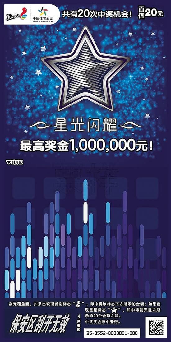 “星光闪耀”共有3个票面,以夜空中的星星为主形象,底色分别为紫、蓝、黑,采用“找中奖符号+通吃”的组合玩法,简单易懂。 “星光闪耀”的具体游戏规则为:刮开覆盖膜,如果出现顶呱刮标志“ ”,即中得该标志下方所示的金额;如果出现星星标志“ ”,即中得刮开区内所示的20个金额之和。中奖奖金兼中兼得。 情感祝福类即开票是顶呱刮的“保留曲目”,如30元面值的“大吉大利”、20元面值的“日进斗金”、10元面值的“吉祥如意”等,均深受购彩者喜爱。 值得一提的是,购彩者每购买一张“星光闪耀”,将贡献4元体彩公益金,在为补充全国社会保障基金、医疗救助、教育助学、扶贫、法律援助等公益事业贡献一份力量的同时,也完成了一次随手做公益的善举。