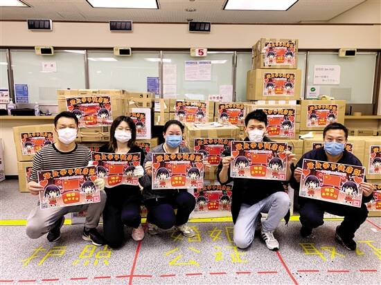 ■昨日上午,1万份留学生“健康包”抵达日本大阪,部分中国驻大阪总领馆的工作人员给“健康包”贴上馆员的原创漫画后,合影留念。中国驻大阪总领事何振良通过视频连线领区30多所大学的留学生代表,对“健康包”进行了“云端交接”。总领馆工作人员表示,将用最快的速度将“健康包”发放至领区内各学友会,送到留学生手中。新华社发 |