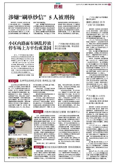 近日,广州市南沙区海力花园小区有多名业主向新快报记者反映,称常有业主将车停放在小区内的人行道和路面上,其中不乏“僵尸车”,小区内一停车场上的平台还成了业主们种菜、种树、养鸡的菜园。业主们多次向物业