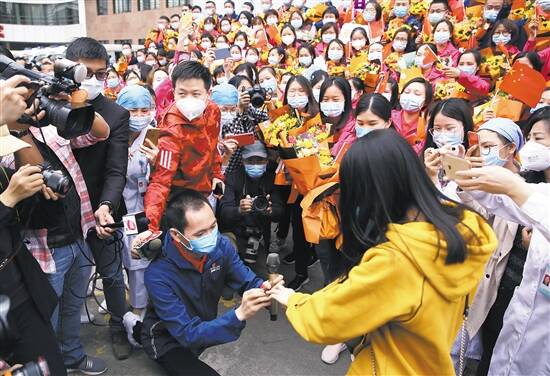 ■4月13日上午,中山三院第三批援鄂医疗队133名队员结束14天的隔离休整,返回广州。图为护士陈柏五向同为中山三院护士的何丹丹求婚。 新快报记者 孙毅/摄 |