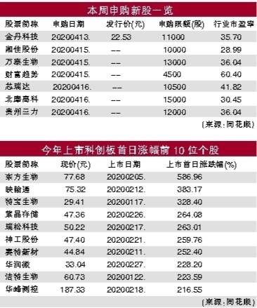 年初以来,证监会共核准44家企业IPO,同意23家企业科创板注册;57家企业完成发行,融资823.77亿元。4月10日证监会核准5家企业IPO,相比今年平均每周核准3家企业,IPO有所提速。10日,核发IPO批文的5家多为中小企业,其中,三人行、宇新股份和长源东谷预计募资均超10亿元。监管部门表示,在维护市场基本稳定运行基础上,既会不因各种因素暂停IPO,也不因各种因素降低把关质量,发挥好资本市场服务实体经济发展、服务维护经济稳定发展大局的作用。 从本周发行的7只新股来看,涉及中药、高端装备和家禽养殖等行业。其中,金丹科技属于国内乳酸及其衍生产品生产龙头企业,产品已销往全球80多个国家和地区。湘佳股份是湖南省家禽养殖销售龙头企业之一,公司的客户主要有永辉超市、大润发和盒马鲜生等。万泰生物是国内创新免疫诊断产品和创新疫苗研发领先企业。 有数据显示,近一年申购新股开板平均涨幅超170%,中签率中值0.038%,今年以来东方生物以首上涨586.96%夺冠。作为本周被市场认为有望最赚钱的新股,4月15日(周三)发行的科创板财富趋势是国内证券行情交易软件产品重要供应商,2019年净利润为1.74亿元,同比增长22.13%,申购只需4.5万元,券商预测发行价在123.5元至136.5元区间,如果按照新股平均涨幅计算,预计中一签将有望获利达10万元。 一直以来申购新股大多都有超值的利益,但涨幅与市场的强弱度有一定的关系。昨日,A股市场成交量大幅萎缩,相较之前成交量过万亿元,两市合计成交不足5000亿元。本周将迎来国内一季度各项经济数据落地,券商预计投资、工业、消费数据同比负增长,一季度GDP增速或降至-5%,扰动市场,市场避险情绪仍浓,A股仍有业绩继续下修和海外二次探底的压力。中信证券表示,随着一季度经济数据的披露以及海外疫情的趋稳,预计市场底部拐点也因此将在各项经济数据落地后得到确认。