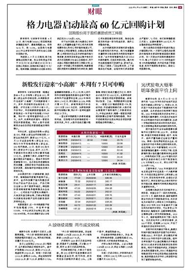 新快报讯 记者陈学东报道 4月13日,格力电器(000651)受回购消息刺激跳空高开,最高涨幅超6%,收报56.51元,涨 5.15%。这是格力电器2010年以来首次
