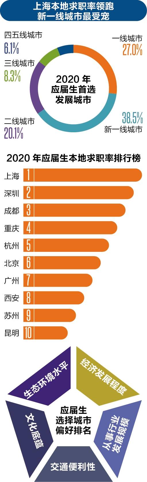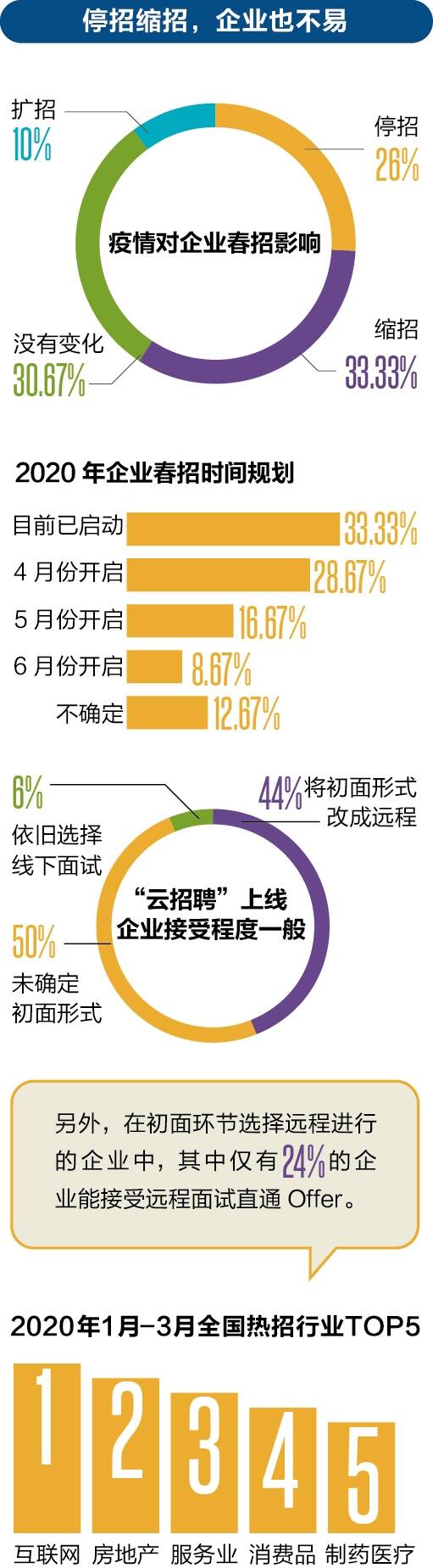 疫情冲击之下,保证现金流成为企业的第一要务,停招/缩招则成为老板们的必然选择。猎聘数据显示,33.33%的企业表示将会缩招,还有26%的企业暂停了校招;另外30.67%的企业表示疫情未影响校招计划,而扩招的企业仅占10%。企业的停招、缩招,也是导致应届生就业难的一大重要原因。在关于就业中所遇到的问题调查中,“企业缩招/停招”、“竞争激烈”、“求职周期被拉长,不确定性增加”成为目前让应届毕业生们头疼的主要难题。 线下招聘方式的停摆,企业纷纷调整战略,转战线上招聘。在面试形式以及Offer发放层面,职业蛙数据显示,部分企业将面试流程进行整合缩减,44%的企业在初面环节将面试形式改成了远程(电话面试/视频面试),50%的企业未确定初面形式,6%的企业依旧选择了线下面试。另外,在初面环节选择远程进行的企业中,其中仅有24%的企业能接受远程面试直通Offer,绝大部分的企业仍需要线下面试辅助确定是否给候选人发放最终聘请通知。由此可见,企业招聘周期将进一步被拉长。 此外,在可接受远程面试直通Offer的企业中,科技/软硬件/通信、咨询和汽车/制造/电气行业三大行业支持的企业数占比超过60%。面试轮次和难度上,多数企业受访表示,相比正常情况下,面试流程会做整合精简,面试轮次也相对减少,但同时难度会着重提高,用于选拔更优秀的求职者。另外,春招季中,企业对求职者学历要求更加苛刻,应届生岗位中明确要求本科及以上学历的比例为 49.5%,同比2019年增长13%。 从企业方角度看,超过八成的HR都在调研中表示对2020年的企业校园招聘有信心。随着疫情进一步得到控制,企业校园招聘活动也在逐渐恢复,过半的企业将会从4月陆续开始大规模校招,其中在4-5月份开启校园招聘的企业将达到45.34%。由此看来,经历前两个月的沉寂期,春招将在四五月份迎来一波小高潮,应届毕业生就业机会进一步增加。 上海应届生本地求职率高居榜首 新一线城市吸引力增强 就业城市显然是应届生的一大重要选择关口,近年的数据表明,应届生就业城市趋向于多元化,除了人才密集机会更多的一线城市,新一线城市、二线城市也受到毕业生“宠爱”,呈现“三雄争霸”的格局。 一线城市由于经济、文化、人才引进政策等各方面的优势,一直处于“人才大战”中的顶端,毕业后选择在北上广深工作的应届生仍占大部分。与此同时,应届生的本地求职率发生细微变化,从2020年1月到3月的求职数据来看,上海和深圳是大多数大学生的首选,其中上海应届生本地求职率以83%高居榜首,成都、重庆、杭州应届生的本地求职率则位列新一线城市三甲。但由于疫情期间产能恢复较慢、中微企业需求较少的原因,北上广深的应届生招聘需求近三年来首次跌破三成。 BOSS直聘研究院数据显示,2020年春招季新一线城市吸引了38.5%的应届生,同比再次上升,超出一线城市11.5个百分点。其中杭州、成都、南京、长沙和西安五个城市的新增应届生岗位最多。另外,二三线城市的应届生招聘需求比例也提高了3.3个百分点。行业专家分析认为,二三线城市虽然需求增长,但一定程度是疫情下的就业市场供需关系失衡所致,但从二三线城市的前往意愿来看,仍处于下降的趋势。 互联网+、5G等新兴行业招聘需求增加 从行业角度分析来看,疫情对于传统行业的冲击可见一斑,生产制造、服务、金融、进出口等行业纷纷在疫情期间按下暂停键。其中“受伤”较为严重的则是金融行业,应届生招聘需求较2019年同期大幅下降。同时,全球产业链的生产供应停滞,也导致进出口行业业务骤减,部分企业甚至出现减薪、裁员现象。此外,能够吸纳大量应届生就业的服务业和贸易行业也受到大范围冲击,应届生岗位数量大幅收缩。 值得一提的是,在众多行业放慢招聘步伐的同时,物联网、5G等新兴行业对应届生较为友好,招聘规模较往年不降反升,应届生岗位也高于全行业均值。数据显示,人工智能、大数据、游戏、信息安全、5G等热门新兴行业在应届生就业中成为“香饽饽”,薪资也相对可观。与此同时,互联网行业以其思维开放的天然优势,更加亲近新生力量,在应届毕业生中新增职位需求最高,以21.32%的占比遥遥领先其他行业。究其原因,行业专家分析认为,一方面互联网行业多以轻资产为主,天然能适应在线上办公;另一方面,互联网行业对新生力量需求依赖性高,应届生的思维较为开阔,即使在疫情期间,也可能将危机转化为契机。 值得注意的是,疫情期间居民外出受到一定限制,对日用消费品、食品衣物需求增大,一定程度上刺激了服务行业增长,因此服务业和消费品行业的招聘需求出现“回潮”现象,人员招聘一定程度出现增加。其中,服务业和消费品行业新增的应届毕业生职位需求位居三四名,占比分别为11.51%和10.91%,仅次于互联网和房地产行业。 ■数据来源:CareerFrog职业蛙《2020春季招聘趋势报告》;领英《2020未来招聘趋势报告》;BOSS直聘《2020应届生春招趋势报告》;猎聘大数据研究院《2020应届毕业生春招求职报告》;天眼查专业版