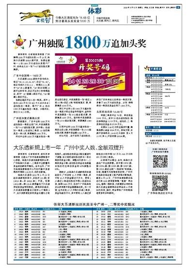 新快报讯 记者陆妍思报道 广州捧得1800万元追加头奖!4月13日,体彩大乐透第20023期开奖,当期全国 唯一1注1800万元追加头奖落户广州,由幸运儿以一张“7+