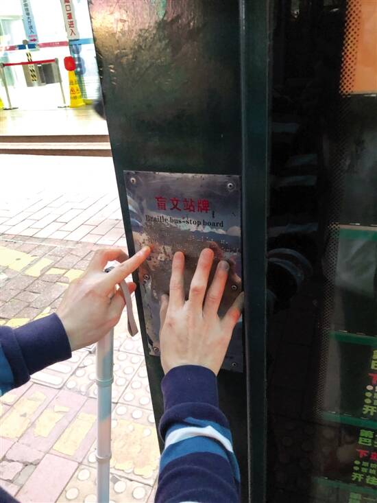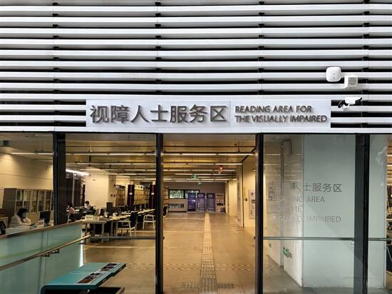 ▲ ▲ ▲ 一进广州图书馆西门,就能看到视障人士服务区。 人民中路一个公交站有盲文标识,但是信息不全。 |