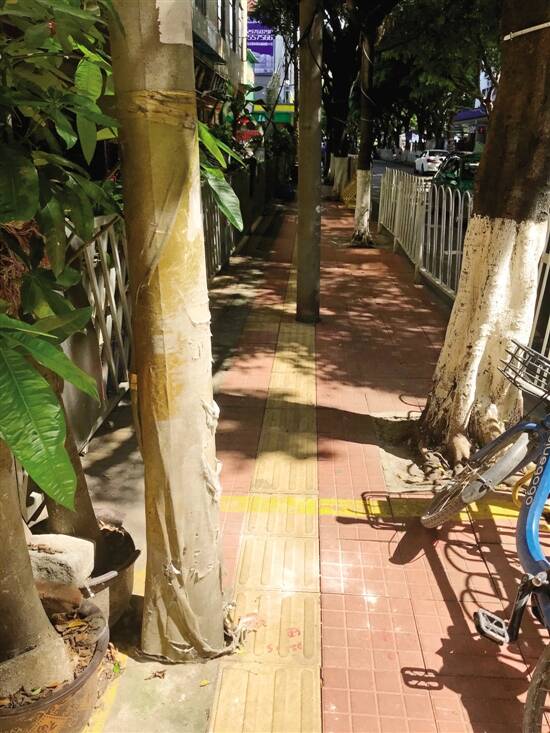 ▲天河区棠东东路,盲道上有两根电线杆,盲人不易通行。 |