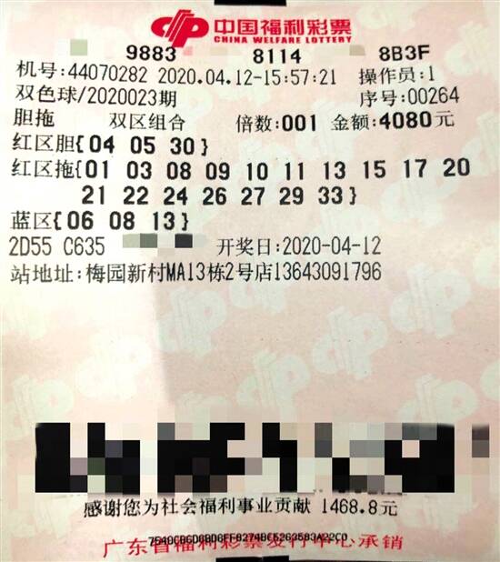 双色球第2020023期的中奖号码为:红球“04、05、20、21、30、33”;蓝球“08”。全国共中出6注一等奖,其中广东省中得1注一等奖,花落梅州市园新村MA13栋2号店,单注奖金7277843元。经检索,中奖彩票为一张自选胆拖票,中得大大小小奖项奖金合计780多万元。据了解,这也是梅州市今年以来第一注福彩双色球一等奖。据统计,去年梅州福彩特别旺,双色球大奖频频眷顾梅州。 开奖后,曾先生低调现身梅州市福彩中心办理兑奖,“为何在市福彩中心兑奖后,还要去省福彩中心办理?”曾先生问道。福彩中心工作人员向曾先生详细介绍兑奖流程,单张彩票的总中奖奖金在100万元以上的,则定义为高等奖,高等奖须经中奖彩票售出地的市福彩中心验票,再到省福彩中心办理兑奖手续,中奖奖金由市福彩中心负责兑付给彩民。 据悉,曾先生是本地人,购买福彩已有多年,他表示每期都会购买彩票,但是购票金额不固定。他称之前因改了一个号码,与福彩双色球大奖擦肩而过,最后错失二等奖。曾先生说:“这次中奖号码都是自己随意选的,没有什么特别的。”办理兑奖手续过程中,福彩中心工作人员想向曾先生了解中奖经过,他则表示不愿透露更多中奖信息。