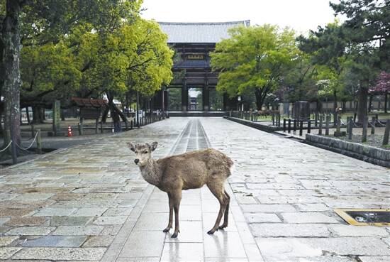 4月18日,在日本奈良,一只鹿站在东大寺门前。 奈良公园的散养鹿群被誉为日本“天然纪念物”,也是日本旅游最受欢迎的打卡点之一。据日本多家媒体报道,受新冠肺炎疫情扩散影响,日本古都奈良市已很久不见外国游客的踪影。加之当地居民避免外出,奈良市内出现了鹿比人多的景象。新华社发
