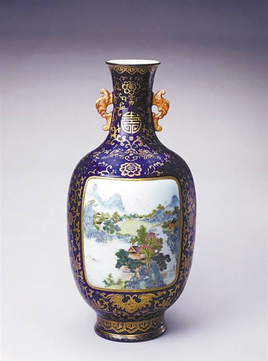 ■清乾隆 蓝地描金开光粉彩山水兽耳瓶 故宫藏 |