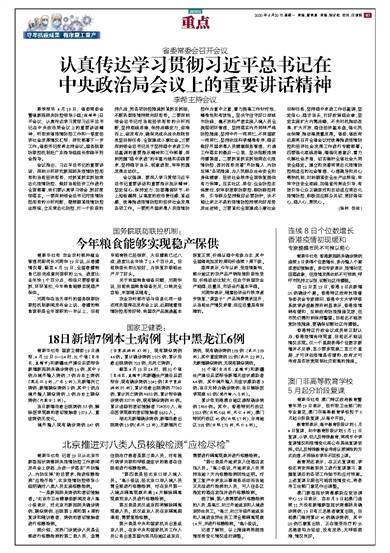 新快报讯 4月19日,省委常委会暨省新冠肺炎防控领导小组(指挥部)召开会议,认真传达学习贯彻习近平总书记在中央政治局会议上的重要讲话精神,听取我省疫情防控工作和一季度经济社会发展情况汇报