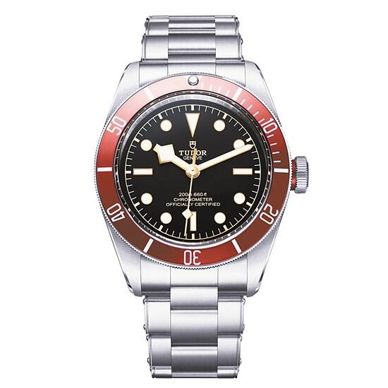 帝舵碧湾系列腕表 表盘带着硬朗的工业风与运动感,哑光酒红色外圈十分醒目。表壳由整块316L不锈钢打造而成,极其坚固,配备旋入式上链表冠及底盖,防水深度达200米。 |