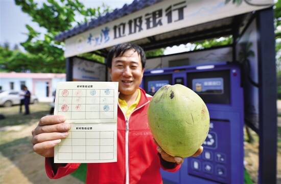 4月28日,文昌市木兰湾的工作人员展示“垃圾存折”,60积分可以兑换一个椰子。 为鼓励游客积极参与垃圾清理,保护海岸线环境卫生,海南省文昌市木兰湾近日试点建立“垃圾银行”。游客在海边收集到垃圾后,可以在“垃圾银行”换取积分,兑换矿泉水、椰子、小吃等礼品。新华社发