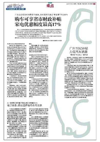 昨日,广东省政府新闻办举行疫情防控新闻发布会,广东省发展改革委总经济师黄华东介绍了《广东省关于促进农村消费的若干措施》(简称《措施》),重点开展汽车下乡和家电下乡两项专项行动。新快报记者从发布会获