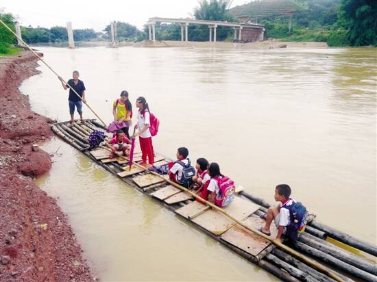 ■梅山大桥建起来之前,尖山村红河自然村的小朋友只能坐竹排上下学,非常危险。 |