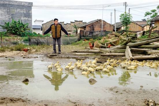 ■涌溪村贫困户吴水林在自家院子养鸡养鸭,从过年到现在,他已经卖了300多只鸡。 |