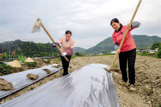 ■在南雄市帽子峰镇洞头村菊花种植基地,贫困户江土地妹(左)忙着铺地膜。 |