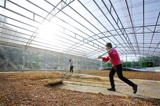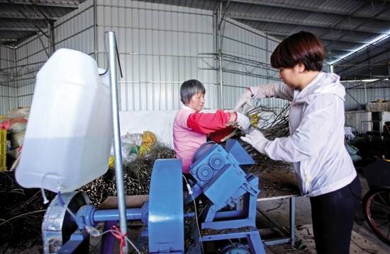 ■趁着阳光好,药材加工厂里的工人抓紧时间翻晒药材。 |