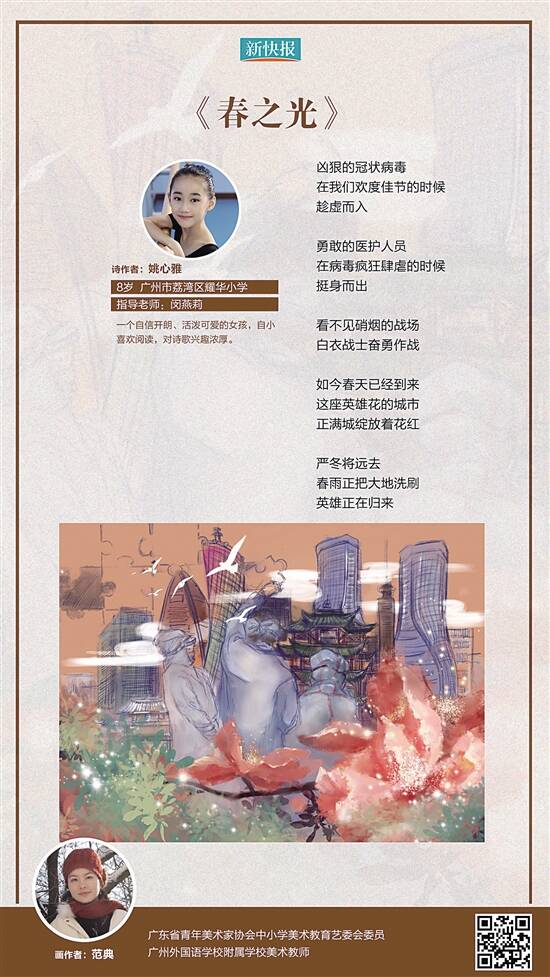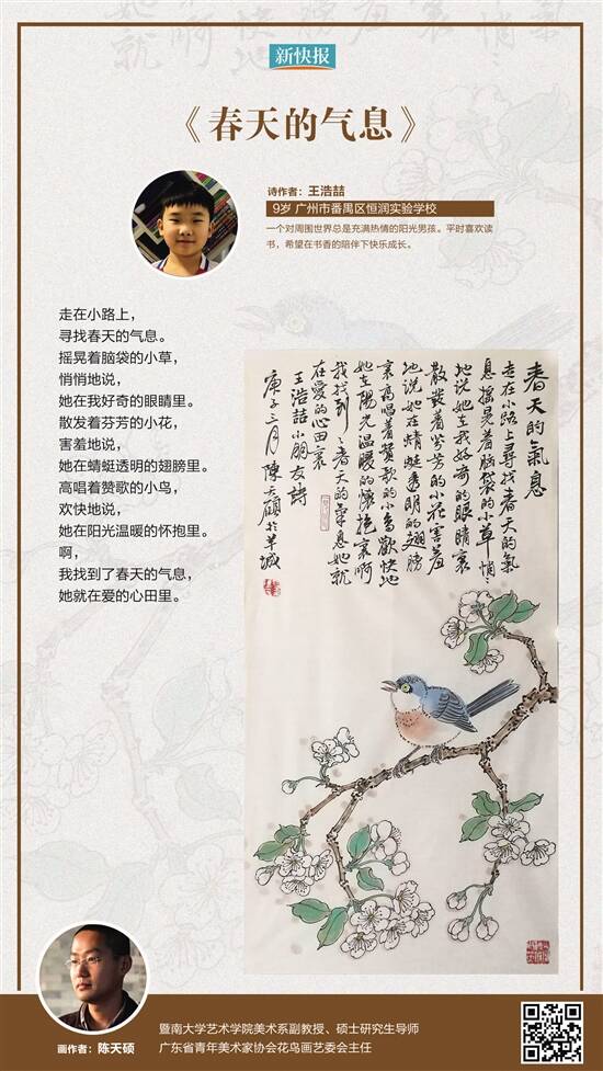 声音 广东省青年美术家协会副主席兼秘书长 张铁威 纯真的童诗给予艺术家更多创作热情,激发更多创作可能 儿童的诗歌非常有想象力,给予我们青年艺术家丰富的创作空间。疫情期间,大家都闭关不出,但心里都在期盼春天。从小朋友的诗歌中可以看到生机勃勃的景象,他们也在期待春天。 而这次活动具有双重意义。首先,它激发了小朋友的诗性,儿童将更乐于创作诗歌。随着现代社会创作或专注诗歌的人越来越少,非常有必要在学生中推广传播诗歌。另外,活动结合了画家配图的形式,能够有效吸引他们。其次,活动激发了艺术家的创作激情。有关抗疫的题材,目前已集成了一批以人为主的抗疫作品。本次活动中儿童的诗歌里有很多表现抗疫的,它们富有想象力,富有诗意,更纯真烂漫。根据小朋友的诗歌来创作,能激发艺术家更多的创作可能性。 广东省青年美协花鸟画艺委会主任 陈天硕 诗画结合极其自然,活动让艺术家重新审视回不到的童年 这次活动有意义又有意思。首先,我们传统文化很讲究“诗中有画,画中有诗”。诗画结合本来就是极其自然的事情。以往画家们都是根据古诗来创作,这次可以和童诗碰撞,机会难得。小朋友有如此高的兴致来写诗,我们给他们配画时也希望能够引起他们的兴趣,激发他们继续创作诗歌的热情。其次,小朋友的诗都很有意思,它们大多数都贴近时代,纯真地表达了对生活的热爱。活动让青年艺术家重新认识儿童,重新审视自己回不到的童年,再次体会天真、质朴的感觉,从而达到回到初心的效果。 作为一个花鸟画家,这次我选择了王浩喆小朋友的《春天的气息》来创作,这首诗里提到了鸟,提到了春天,提到了花,很适合我。作画时非常开心,非常享受,我希望从小朋友的诗意里挖掘出可爱的东西,将画面表现得清新可爱。因此,这次创作稍稍改变了风格,特意将鸟画得胖胖的。 孔子有云:不学诗,无以言。结合目前全国原创儿童诗和现代诗歌创作的现状,为了有效促进广大中小学生的诗歌教育,促使他们爱上诗歌、创作诗歌。3月6日至3月20日,广东新快报社联合广东省青年美术家协会面向全国发起了以“守望春天”为主题的儿童诗歌创作征集活动。活动面向12周岁以下广大的诗歌爱好者,经过三周的征集评选,50位小诗人脱颖而出。 为了展现出“诗中画,画中诗”的文学融合意境,50位艺术家还精心创作出了50幅绘画作品,绝妙地衬托出了50首诗作的内容和意境。4月底,新快报新媒体平台对这些诗配画作品进行了统一展示,并发起网络投票。投票活动截至昨日(5月10日下午6时)结束,前十名“最强人气王”将获得惊喜礼物。据统计,投票期间,新快报新媒体平台浏览量近八万,其中关于作品的投票量近两万。目前,投票结果正在紧张地计算中。 据了解,活动自发起以来就收到各地热烈的响应。据不完全统计,从3月6日起,经过短短两周的征集,组委会收到了来自四川、陕西、江苏及广东各地市的小朋友们的四百余首来稿,还有一些学校专门组织学生参与。50位入围的小诗人均可获得入围奖品及证书一份,入围小诗人的指导老师及艺术家亦可获得荣誉证书。 这边厢,小画家们踊跃参与,那边厢,“画师们”的阵容亦相当强大,其中,为儿童作画的50位艺术家或在广东各美术协会任职、或为国家一级美术师或高校教授。值得一提的是,活动特邀中国美术家协会顾问、中国艺术研究院研究员、故宫博物院研究员许钦松为本次活动题字。为了让这些美的种子生根发芽,组委会还特邀了著名诗人、国家一级作家、获国务院特殊津贴专家、广东省人民政府文史研究馆永久馆员、文学院院长洪三泰为评审顾问。 海珠区江南新村第一小学四年级学生 唐子淇 诗歌发表以后,身边同学也爱上了写诗 我想要更多的人能够去写诗,了解诗。平时我就很喜欢写诗,我经常喜欢走到木棉花树下,被火红的木棉花所吸引。我会好奇,为什么树上一片叶子都没有?为什么掉下来的木棉花还是那么完整?经历了这次疫情之后,我看到和听到许多令人感动的人和事,特别想要表达内心对抗疫英雄们的赞赏和感激,因为有了他们,我们才能安心地在家里生活和学习,所以就写出了诗歌《广州红》。也谢谢画家严康平叔叔为我创作的画,它让我的诗歌更充满了更生动的表达。 诗歌发表以后,我身边的同学也非常受影响,我们经常都会在班群里面发自己写的诗歌,还会创办一些小诗社,下一次活动我还想参加。 花都区教育局城区教育指导中心小学语文教研员 黄少玲 孩子是天生的诗人,活动给予他们展示自我的机会 诗歌创作本来就属于语文教学中的重要内容。我从孩子们的诗歌中感受到了学生们大胆的想象力。孩子是天生的诗人,他们写出了很多大人都写不出来的东西。 本次活动提供给学生一次展示自我的机会,首先让他们能够在公共媒体上发表自己的作品已经非常难得了。另外,活动很重视学生的感受,并非简单颁个证书就了事。有身份有地位的艺术家不计成本、不计酬劳地为学生配画,使得诗、画有了完美的结合。这次活动激发了学生的想象力,提高了他们学习创作的兴趣,进而提升了语文教学的质量。 越秀区黄花小学老师 谢铭姬 作品受到珍视,学生写诗的兴趣更浓了 本次活动“高大上”,专家云集。更重要的是,孩子们的作品受到了珍视。入围的选手每一个都有画家来专门配画,