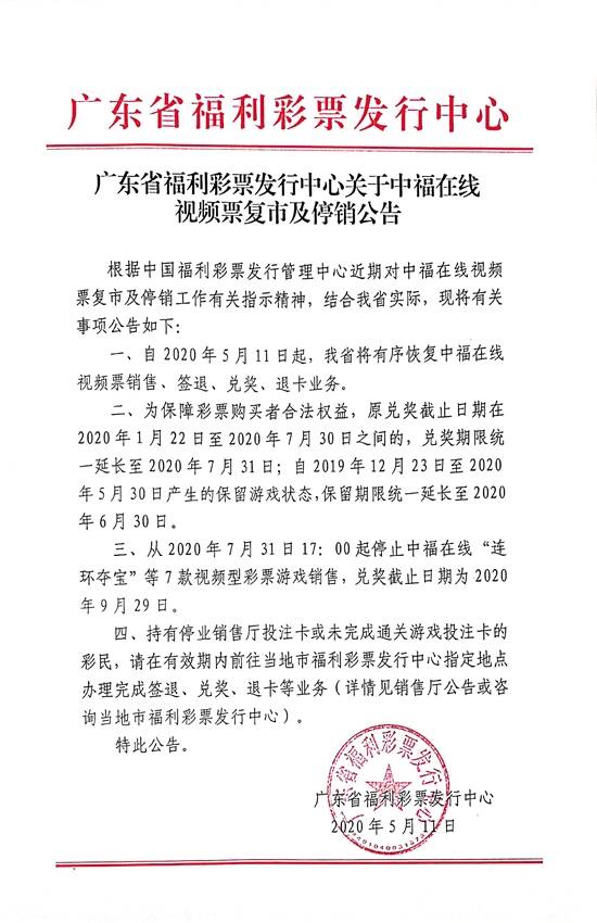 为保障彩票购买者合法权益,原兑奖截止日期在2020年1月22日至2020年7 月30日之间的,兑奖期限统一延长至2020年7月31日;自2019年12月23日至2020年5月30日产生的保留游戏状态,保留期限统一延长至2020年6月30日。 从2020年7月31日17∶00起停止中福在线“连环夺宝”等7款视频型彩票游戏销售,兑奖截止日期为2020年9月29日。 持有停业销售厅投注卡或未完成通关游戏投注卡的彩民,可在有效期内前往当地市福利彩票发行中心指定地点办理完成签退、兑奖、退卡等业务(详情见销售厅公告或咨询当地市福利彩票发行中心)。