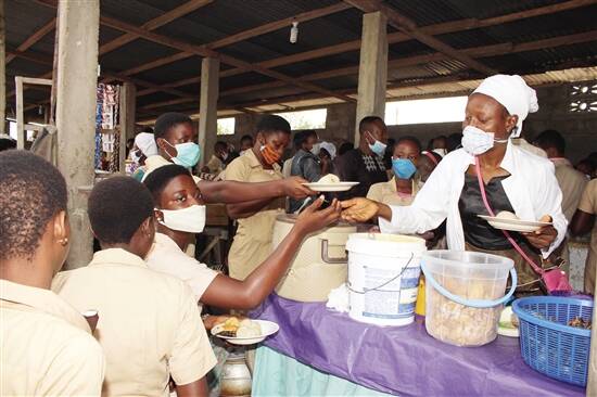 5月11日,在贝宁经济首都科托努,中学生戴着口罩排队打饭。 贝宁政府宣布,自11日起取消在该国15个受疫情影响较大城市实施的卫生隔离措施,同时全国所有学校自11日起复课。贝宁是一个位于西非中南部的国家。 新华社发
