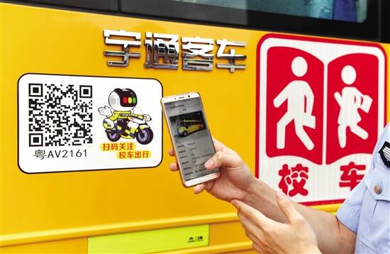 新快报讯 记者何生廷 孙毅 通讯员交宣报道 昨日,记者从广州交警获悉,为加强校车安全源头管理,广州交警联合市教育部门组织全市4000多辆校车粘贴二维码,正式实施校车“一车一码”监管措施。广州交警通过给全市每辆校车定制一个二维码“身份证”,并将该二维码粘贴在对应校车外部车身的显眼位置,只需扫码便可查询到该车的车辆状态、使用学校、车辆所有人、标牌有效期等相关信息。 广大家长、市民朋友只需通过手机扫描校车车身粘贴的二维码,即可轻松获取小朋友乘坐的校车信息,发现问题校车,动动手指就能向广州交警举报(通过“广州交警”微信公众号的校车举报栏目)。