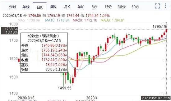 A股方面,昨日黄金板块大涨,个股全部飘红,赤峰黄金涨停,中金黄金和山东黄金等涨幅均超8%,当日大盘涨0.24%。机构表示,全球主要经济体量化宽松政策不断刺激下,负利率债券占比长期高位有望继续催生黄金牛市,黄金股业绩弹性和资本运作潜力有望充分展现。 上周以来,现货黄金突破此前震荡区间,接连5天迅猛上涨,5月15日金价突破1750美元/盎司关口后,昨日持续发力,盘中最高涨至1765美元/盎司。截至发稿,现货黄金报收1762.44美元/盎司。沪金主力合约涨2.92%,报401.16元。兴业研究分析师张峻滔认为,黄金呈现出较强的“商品属性”或“抗通胀属性”,以原油为代表的大宗商品价格反弹,而美国国债收益率相对稳定,使得实际收益率下降,对黄金构成利好。 彭博汇编的最新数据显示,交易所交易基金的黄金持仓量突破3000吨,触及纪录高位。今年至今,流入规模超过420吨,已远超2019年全年的流入规模。世界黄金协会统计,全球黄金ETF持仓在今年3月增加了151吨,令总持仓规模达到了创纪录的3185吨。从今年一季度整体情况看,全球黄金ETF及类似产品持仓在一季度增长了298吨,合计净流入230亿美元,这是史上最高的以美元绝对值衡量的季度资产管理规模增幅,同时其持仓的吨数增长则为2016年以来的季度最高。 分析人士表示,逊于预期的美国经济数据增加了黄金的看涨理由。美国4月份通货膨胀率下降,5月8日当周有298万人申请失业。这一数字低于危机开始时令人震惊的600多万人,但仍表明在不久的将来失业率将超过20%。此外,近期美国方面公布了市场关注的美国4月零售销售数据,大幅低于预期。美国4月零售销售月率下降16.40%,超过预期的下降12%,为1992年有记录以来最大降幅。 从技术上看,分析人士表示,黄金已经突破多年高位1745.45美元,技术上仍保持看涨立场,并向1760美元区域延伸。现在20日移动均线向上移动,金价预计将继续上涨,有望迈向1800美元。 A股方面,国盛证券表示,金价上行提振矿产金企业盈利水平,矿产金业务比重更高的企业更受益于金价提升。矿产金体量与业绩纯度来看,山东黄金、恒邦股份和赤峰黄金比值较高。