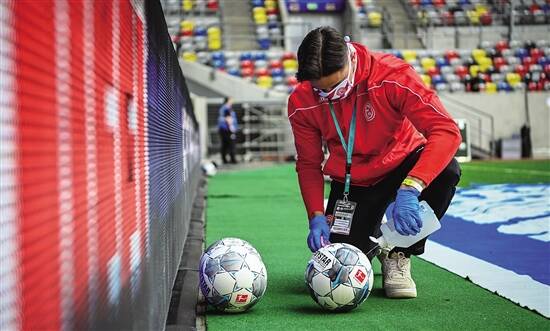 ■5月16日,在杜塞尔多夫对阵帕德博恩的比赛中,工作人员在场边对比赛用球进行消毒。 新华社发 |