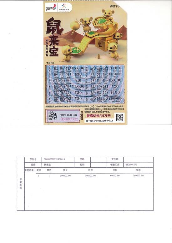 出奖的4401001079体彩实体店位于海珠区荔福路111号。据中奖人阿诚(化名)介绍,他平时有买彩票的习惯,时不时都会买上几注彩票玩玩:“平时会买点大乐透,顺道看上哪个即开票觉得好看也会买几张。”阿诚说,那天在店里买完彩票,看到这款“鼠来宝”,心想:鼠年开局被疫情“捣乱”,现在国内情形基本控制住了,不如买张试试吧。“本来我也不抱什么希望的,前面刮出一个小老鼠(中奖图案),可惜只有一只。没想到刮到最后居然出现两只小老鼠,我赶紧刮开金额看看,前面是¥30,我以为是3000,后来瞄了一眼上面几行显示的奖金金额,上面那些0比这个0要胖,而这是个瘦子,我顿时就暗暗说了一句‘有戏’,赶紧全部刮开,真的是大奖呢!” 据悉,“鼠来宝”是顶呱刮即开型体育彩票在猪鼠跨年之际隆重推出经典的生肖套票,延续了往年生肖票的多种玩法,与往年生肖票连成生肖系列产品。它借用了中国传统曲艺“数来宝”的谐音,象征鼠年吉祥发财的美好寓意。该票种共有3个版面,票面主形象为卡通老鼠和财宝,形象可爱、生动、有趣。票面的设计风格新颖,颜色鲜亮醒目。其游戏规则也非常简单,刮开覆盖膜,在任意一场游戏中,如果出现两个相同的“鼠”标志,即中得该场游戏右方所示的奖金金额;如果出现“顶呱刮”标志,即中得该场游戏右方所示奖金金额的3倍。中奖奖金兼中兼得。最高奖金30万元。