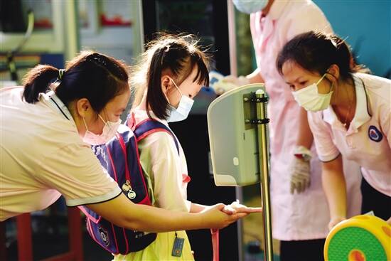 5月25日,海南省琼海市中兴幼儿园的老师在校门前为小朋友洗手消毒。当日,海南省琼海市幼儿园大班和特殊教育学校开园。新华社发