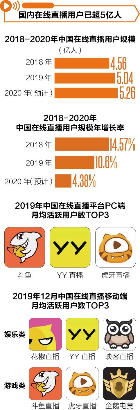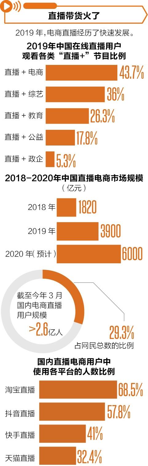 ■采写:新快报记者 郑栩彤 ■制图:廖木兴 2016年网络直播兴起后不久,其“风头”便或多或少被短视频所掩盖。但2019年至今,直播形式和盈利模式更加多元的网络直播再度火遍全国。一大原因便是直播“+”上了更丰富的内容,例如游戏、综艺、公益、电商等。只要有需要,直播就能“傍上”某种业态。其中,风头最盛的无疑是电商直播。数据显示,截至今年3月,我国电商直播用户已超2.6亿人,其中超过50%的用户已习惯每月至少一次通过直播购物。 疫情期间,网上购物特别是直播购物进入了更多人的生活。李佳琦一句“买它”,几千份精华露瞬间卖空。除食品、化妆品、日用百货外,房子、车子、保险、火箭发射服务等商品或服务也上了直播间。直播电商的想象力着实令人着迷。然而,在直播间成交额屡创新高、相关股票频频上涨的同时,股价虚高、直播卖货售后难保障等问题也浮出了水面。 近日,国家统计局新闻发言人毛盛勇表示,推动经济平稳运行,在稳定外贸外资基本盘的同时,一定要扩大内需。直播带货等互联网相关的新兴消费形式会成长得更快,表现更加强劲。 2020年,我们可以称它为直播带货元年。网红主播如薇娅、“口红一哥”李佳琦,已经被奉为“行走的种草机”,拥有绝对的“顶级流量”。根据淘榜单的数据,李佳琦的粉丝数已达2185.9万,薇娅的粉丝数已达1784.1万。 天眼查专业版显示,在纷繁复杂的带货商品中,到底哪些商品最火?根据淘宝发布的经济榜单,答案可能是:日用化妆品。淘宝公布的年度爆款商品Top 10中,各类化妆品、护肤品占了7个之多。 融合游戏公益电商等内容,网络直播焕发生命力 自2016年起,国内在线直播用户规模稳步增长。艾媒咨询数据显示,2019年中国在线直播用户已达5.04亿人,预计今年还将增长到5.26亿人。目前,网络直播用户占网民整体约六成。从形式看,电商直播发展最为迅猛。直播用户中,2019年观看电商直播的人数占比已超四成。截至今年3月,国内观看电商直播的用户数量更是达到2.65亿人,占国内网民整体29.3%。 此外,网络直播还有游戏直播、公益直播、企业直播和电商直播等。中国互联网信息中心数据显示,截至今年3月份,游戏直播、真人秀直播、演唱会直播和体育直播的国内用户规模也分别达到2.6亿、2.07亿、1.5亿和2.13亿,分别占网民整体28.7%、22.9%、16.6%和23.5%。2019年,花椒直播有《花椒K歌夜》等5款综艺直播节目,斗鱼推出了《鱼乐星之旅》等两款节目,虎牙直播则有《娱乐大王牌》等6款直播综艺。公益直播形式也获得一定关注。艾媒咨询数据显示,分别有33.6%和26.7%的直播用户观看了淘宝直播的“爱满民尖”明星直播公益活动和虎牙直播协办的“伴艾骑行”活动。 今年初,由于疫情限制,线下的酒吧蹦迪、音乐节也走到了线上直播。2月份,酒吧One Third直播5小时便收到超200万元打赏。网易云音乐“云村卧室音乐节”开播首月累计观看人数达到1600万人。新快报记者了解到,音乐节直播内容可由直播平台采买,音乐节制作方还可获得用户打赏。今年4月底,音乐节主办方摩登天空宣布探索线上音乐节付费,并推出常态化线上音乐节。在改变音乐体验形式的同时,蹦迪和音乐节线上常态化直播也成为直播平台方和内容制作方的盈利增量。 服装、快消品最受宠,火箭、商品房等也登台 直播的火热很大程度上得益于用户直播购物习惯的养成。与直播刚诞生时相比,人们不再仅仅为喜爱的网络直播主播打赏,还会在直播中进行多类型的消费行为。艾媒咨询数据显示,2019年有36.4%的直播用户会购买主播推荐的商品,32%的用户会购买广告栏商品。参与平台活动、开通平台会员、购买PUGC内容和打赏主播也是常见的直播用户消费行为。其中,每三个月至少在直播间中购物一次的用户达九成,超半数直播电商用户每月至少一次在直播间中购物。商品价格优惠或性价比高、所推荐商品品质较好是消费者在直播间购物的主要驱动力。 从消费者的直播电商购物偏好看,约六成消费者愿意在直播中购买服装和日用百货,约半数消费者愿意购买美食和美妆,约两成消费者愿意购买家电和游戏产品。头部带货达人薇娅和李佳琦销售的货物更是以美妆、食品饮料等快消品为主。3-4月,淘宝直播中最畅销的5个品牌为阿迪达斯、九阳、雅诗兰黛、三只松鼠和百草味。艾媒咨询分析师指出,较高的利润率和复购率是快消品成为直播带货达人热衷品类的主要原因。 由于疫情影响线下消费,今年以来有更多商品类型走进了直播间。今年4月,薇娅在直播间售卖火箭运载服务及品牌服务,产品上架后5分钟便有超800人拍下50万元定金,最终产品以4000万元的售价卖出。李湘则在直播卖房20分钟后,卖出了20套房子。今年5月的薇娅直播间中,荣威的一款预售车型上线约30秒就卖出了4180辆。 带货主播的组成也更加多元。除了薇娅、李佳琦等专职主播,不少影视明星和接近农产品产地的县长也开始直播带货。从直播效果看,明星陈赫、刘涛和汪涵近日的首场直播分别创造了8300万元、1.48亿元和1.56亿元的销售额,自带流量的明星成为直播带货的一支主力军。县长、网红直播售卖农产品也成为今年网络直播中一道亮丽的风景线。近日,国务院扶贫办还联合拼多多启动了“消费扶贫百县直播行动”,拟由贫困地区市县长带头,组织100场消费扶贫直播活动。截至5月中旬,拼