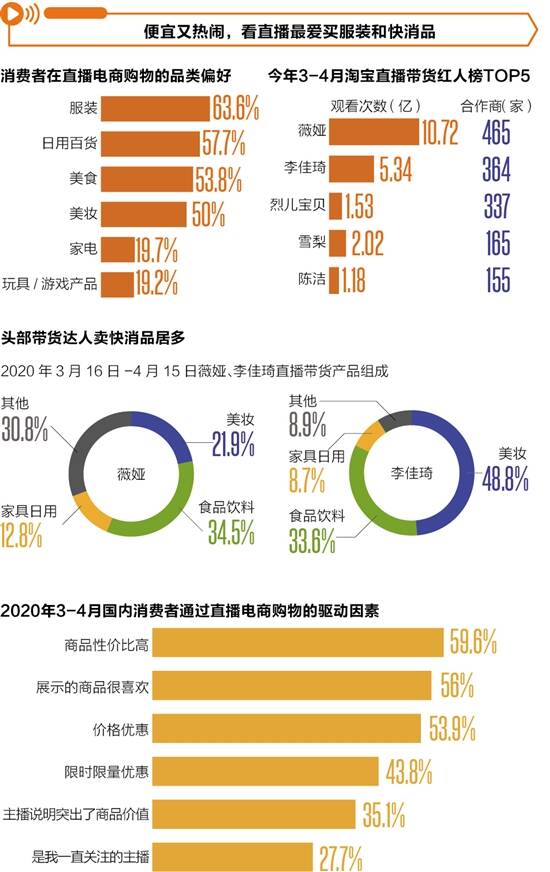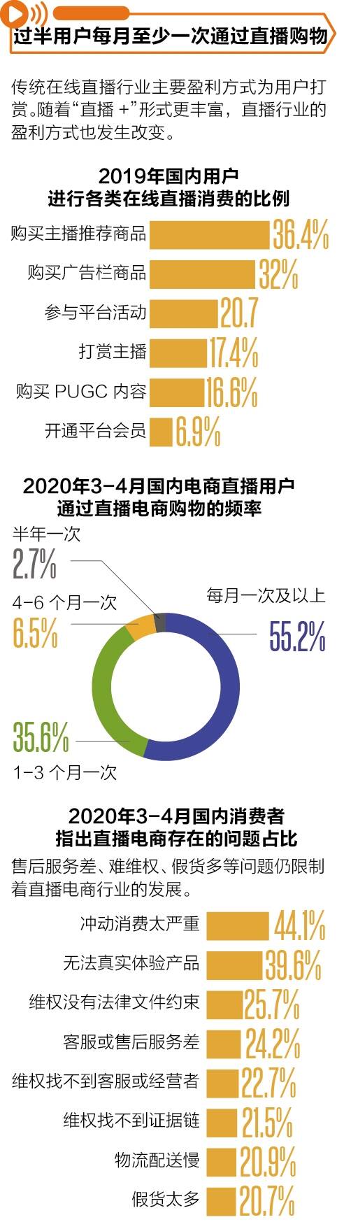 货不对板、售后难保障,直播购物弊病待解决 直播带货模式火爆的同时,因产品质量或产品信息不透明等问题,电商直播间“翻车”事故还是层出不穷。今年情人节前,罗永浩在直播间销售玫瑰花,但不少消费者收货之后却发现玫瑰花已打蔫或腐烂。此前,罗永浩售卖小龙虾,但收到货后不少消费者才发现小龙虾的生产日期是去年5月。去年,李佳琦在直播间销售的一款脱毛仪也被爆出货不对板、机身磨损等问题。 据中国消费者协会近日发布的《直播电商消费者满意度在线调查报告》(下称中消协《报告》)显示,有37.3%的消费在直播购物中遇到过消费问题,但其中仅有13.6%的消费者表示会进行投诉,近半数消费者因认为“损失比较小”放弃维权,还有不少消费者认为投诉处理流程复杂和投诉无实际用途。艾媒数据也显示,商品售后服务差、消费者维权难是直播电商的主要弊病。不少消费者指出,在直播间购买商品后维权没有法律文书约束、维权难以找到客服或经营者和维权找不到证据链。 中消协《报告》表示,目前的法律法规体系下,在直播电商行业中相关平台、经营者与主播责任界定划分等问题上,还有必要进一步理清。建议相关平台明确经营者责任义务、有关部门和平台加强对主播群体的规范管理。同时建议消费者养成良好维权意识和习惯,保留必要的交易凭证,及时揭露和举报相关违规违法行为。 “贴上”网红直播概念后,多只股票迎来了大涨 网红直播的火热也吸引了一批上市公司布局相关业务。截至发稿日,万得网红经济概念股共有36只。据新快报记者统计,其中有完美世界等13家信息技术公司、光线传媒等10家主业务为传媒、影视或泛娱乐的公司、三维通信等4家广告公司、梦洁股份等4家服装纺织公司,还有5家公司属于家庭与个人用品行业、百货商店行业、建筑行业和汽车零配件行业。“贴上”网红经济概念后,多只股票迎来了多日大涨。 其中,因与网红薇娅签约合作,梦洁股份5月12日起连续8日涨停。5月下旬,因企业连续两年陷入亏损、多次欠债被追讨等丑闻而仅剩10亿元市值的长城影视宣布,将拓展“网红+直博+短视频”的新零售供应链生态圈。随后,长城影视的股价连续3日涨停。网红直播概念仿佛天然具有拉升股价的神奇魔力。 但新快报记者查阅相关概念股的业绩发现,不少企业业绩表现与其连涨的股价并不匹配。实际上,36只网红经济概念股中,有12只股票今年一季度陷入亏损。仅11只在今年一季度实现净利润同比上升,其中大多数还是属于信息技术公司。网经社电子商务研究中心特约研究员陈虎东表示,网红带货拉动零售上市公司涨停其实是一种“现象级”的情况,难以长时间持续。网红经济最终还是将成为一种商业营销方式的补充。 网红带货相关股票多日翻红也引来了深交所的关注问询。5月18日,深圳证券交易所向梦洁股份下发关注函,要求梦洁股份说明是否存在利用其他信息披露渠道主动迎合“网红直播”市场热点进行股价炒作并配合股东减持的情形。梦洁股份随后否认了这一“指控”,并表示薇娅今年3场直播为公司带来的实际收入不足600万元。上周五起,梦洁股份股价开始翻绿。本周一,梦洁股份跌停。深交所公告表示,对连续多日涨跌幅异常的梦洁股份将持续进行重点监控,并及时采取监管措施。自5月20日起,万得网红经济指数开始回吐涨幅。 ■数据来源:艾媒咨询《2019-2020年中国在线直播行业研究报告》、艾媒咨询《2020年3-4月中国直播电商行业月度运行数据监测报告》、前瞻产业研究院《2020年中国直播电商研究报告》、中国互联网信息中心《第45次中国互联网络发展状况统计报告》、天眼查专业版