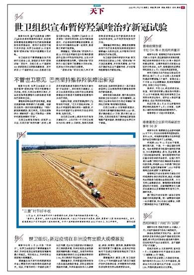 据新华社电 鉴于近期英国《柳叶刀》杂志发表的观察报告显示,抗疟疾药物氯喹或羟氯喹对治疗新冠病毒感染没有明显益处,使用不当甚至可能引发并发症,世界卫生组织25日宣布暂停“团结试验”项目中羟