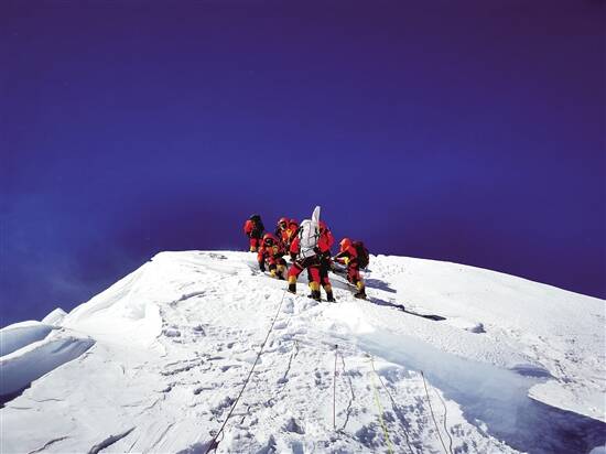 ■27日,中国2020珠峰高程测量登山队登顶“地球之巅”珠穆朗玛峰,为珠峰“量身高”。队员在峰顶停留150分钟,顺利完成峰顶测量任务,创造了中国人在珠峰峰顶停留时长新纪录。新华社发 |