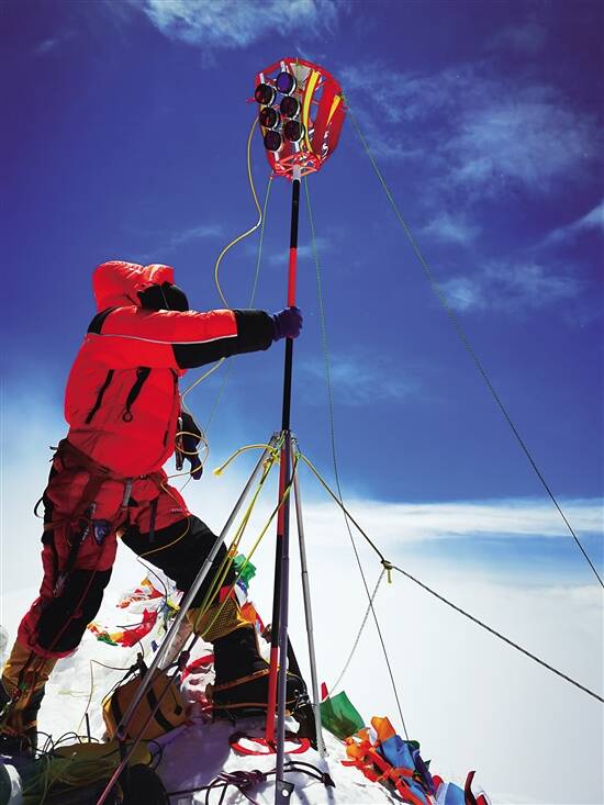 ■5月27日,2020珠峰高程测量登山队队员在珠峰峰顶开展测量工作。新华社发 |